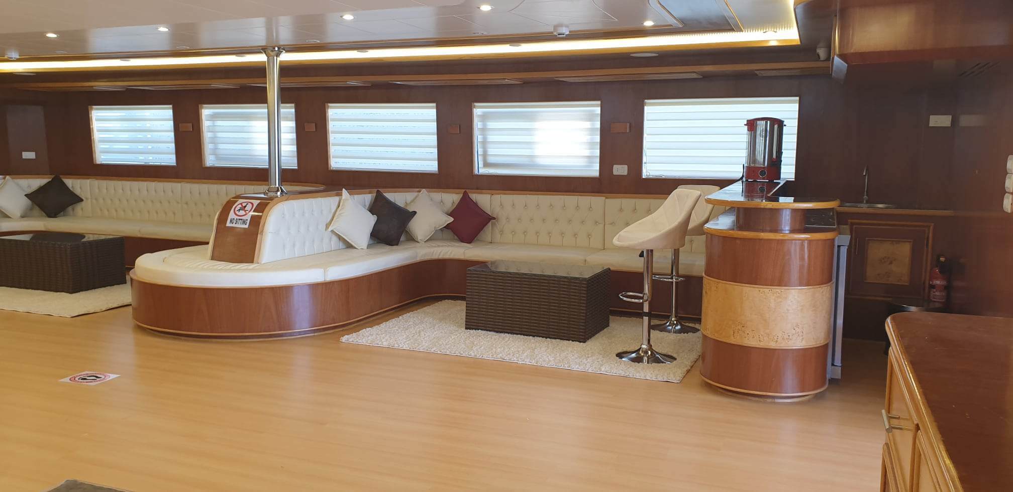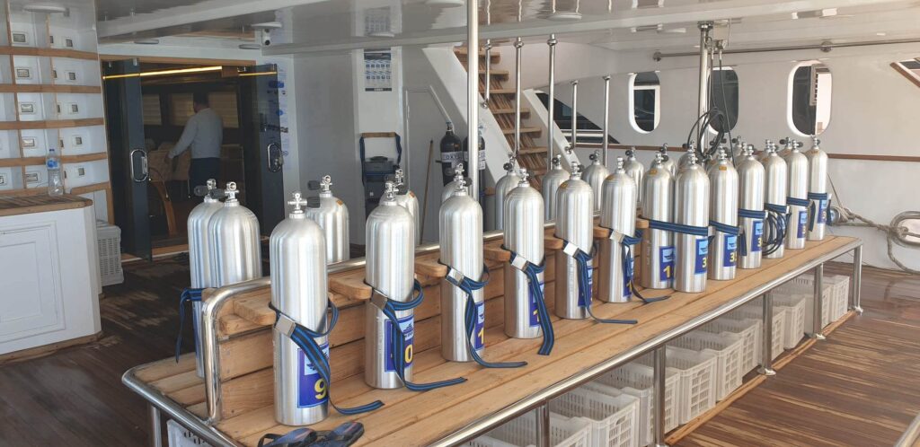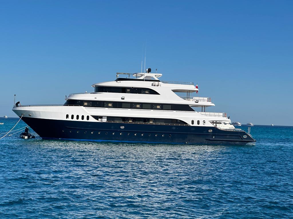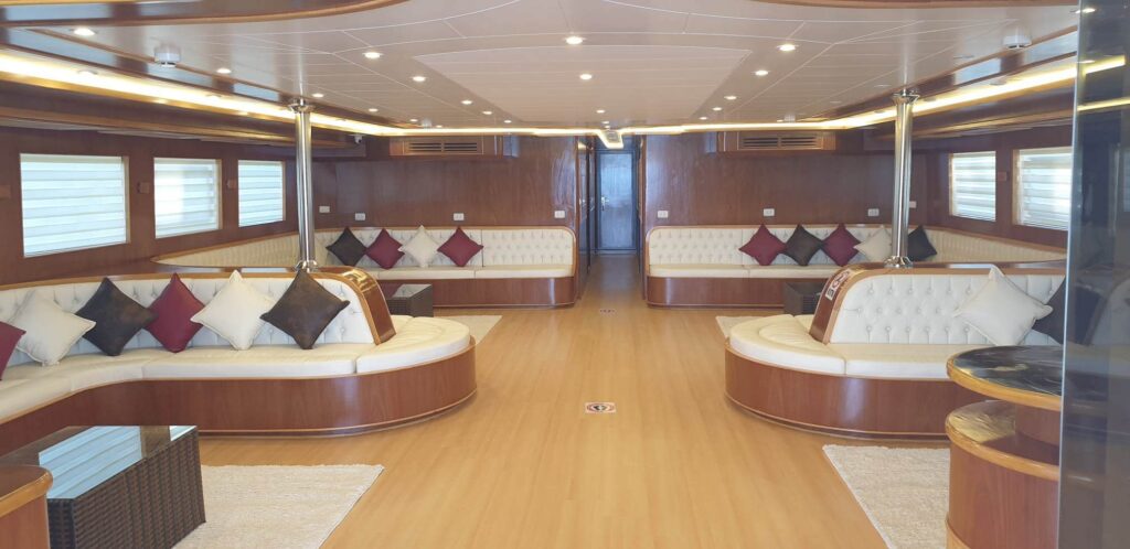 I SUOI CINQUE PONTI SONO DOTATI DI TUTTO CIÒ DI CUI UN SUBACQUEO POTREBBE AVER BISOGNO IN MARE. C’È UN TAVOLO PER L’ATTREZZATURA FOTOGRAFICA, UNA VASCA IDROMASSAGGIO, ARIA CONDIZIONATA REGOLABILE AUTONOMAMENTE, FRIGORIFERI, COMODI MATERASSI, UNA MACCHINA PER IL CAFFÈ E, NATURALMENTE, L’INDISPENSABILE MACCHINA PER IL GHIACCIO.