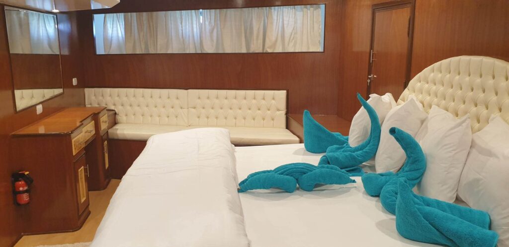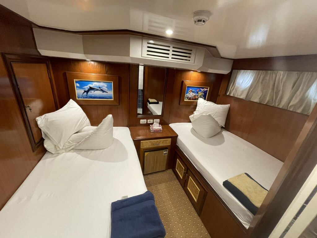 LE CABINE INCLUDONO NOVE CABINE STANDARD SUL PONTE INFERIORE, QUATTRO DOPPIE SUL PONTE INTERMEDIO E DUE SUL PONTE SUPERIORE. TUTTE LE CABINE SONO DOTATE DI ARIA CONDIZIONATA E FRIGORIFERO REGOLABILI INDIVIDUALMENTE. LE CABINE E I BAGNI SONO AMPI E CONFORTEVOLI. OGNI CABINA SUL PONTE INFERIORE HA DUE LETTI DI UGUALI DIMENSIONI, AD ECCEZIONE DELLA CABINA NUMERO 9, CHE HA UN AMPIO LETTO MATRIMONIALE. IL PONTE INTERMEDIO E I PONTI SOLE DISPONGONO CIASCUNO DI SEI CABINE, CIASCUNA CON DUE AMPI LETTI, QUINDI POSSONO ESSERE UTILIZZATE COME CABINE MATRIMONIALI O DOPPIE.