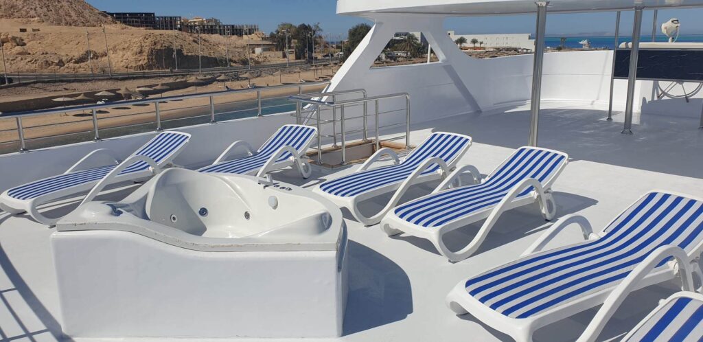 QUESTO PONTE È DOTATO DI COMODI DIVANI, MENTRE IL PRENDISOLE È DOTATO DI LETTINI, CUSCINI E POUF. PER UN MAGGIORE COMFORT E RELAX, ME DISPONE ANCHE DI UNA PICCOLA VASCA IDROMASSAGGIO. GLI OSPITI HANNO ANCHE ACCESSO A UN BAR. QUESTO LIVELLO DISPONE ANCHE DI DUE CABINE DOPPIE CON BAGNO PRIVATO E FINESTRE PANORAMICHE. QUESTE CABINE DISPONGONO DI DUE AMPI LETTI, PERFETTI PER LE COPPIE.