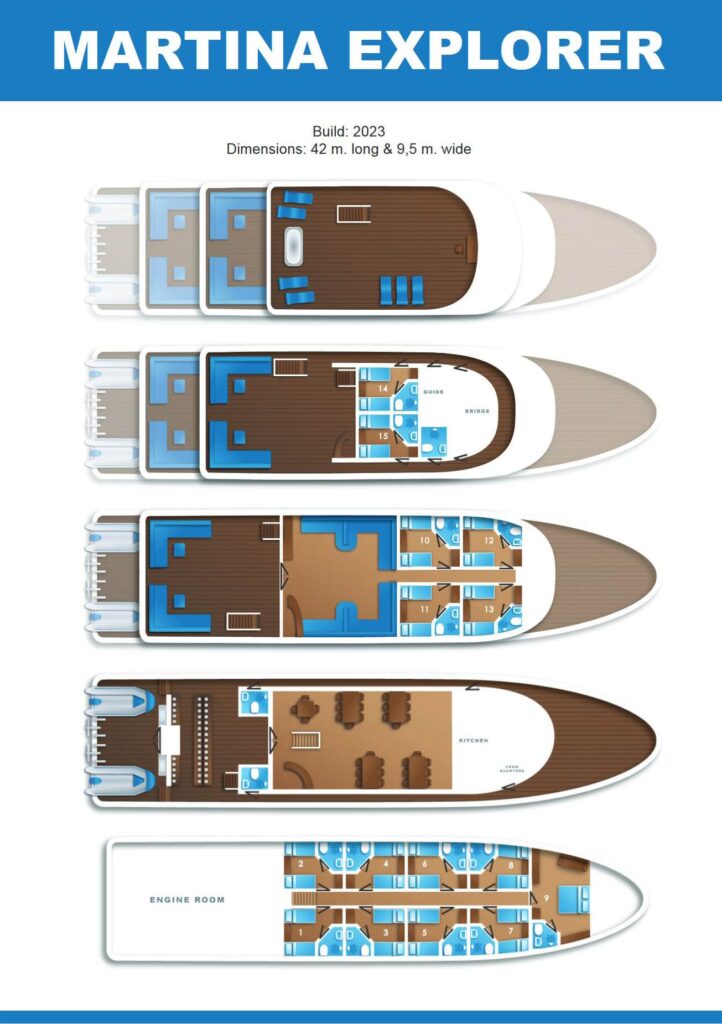 QUESTO PONTE OSPITA IL PONTE IMMERSIONI E UNA CUCINA CON ZONA PRANZO. IL PONTE IMMERSIONI DISPONE DI 30 POSTI PER L’ATTREZZATURA SUBACQUEA E DI SPAZIO PER L’ATTREZZATURA FOTOGRAFICA. QUESTO PONTE È PROGETTATO PER OFFRIRE AI SUBACQUEI UNA MOBILITÀ SICURA, CONFORTEVOLE E SENZA OSTACOLI. CI SONO ANCHE DUE BAGNI IN COMUNE.