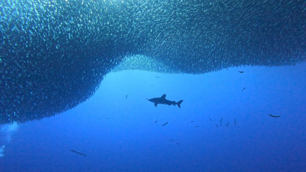 Esemplari di squali grigi si librano in mare aperto mentre branchi di carangidi e barracuda volteggiano a mezz’acqua lasciandosi trasportare dalla corrente. Le due pareti che delimitano il pianoro cadono verticali negli abissi ed è proprio da qui che, con un po’ di fortuna, compariranno esemplari singoli di squalo martello che sovente portano curiosi fin sopra al pianoro per poi sparire nuovamente nel blu.