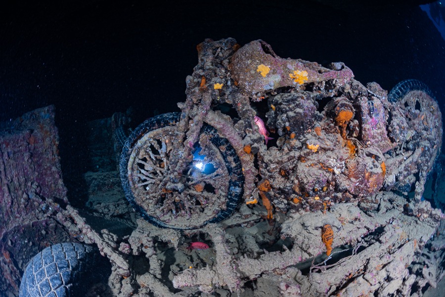 E invece no. Per quanto possa sembrarvi impossibile, la motocicletta più fotografata del mondo si trova a circa 30 metri di profondità sotto la superficie del mare, nella stiva buia di una nave da trasporto inglese affondata nella notte fra il 5 e il 6 agosto 1941 nei pressi dello Stretto di Gubal, dove era alla fonda in attesa di potere attraversare il Canale di Suez.